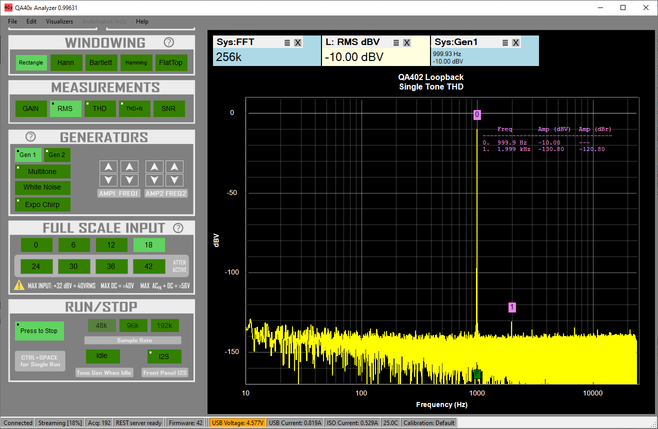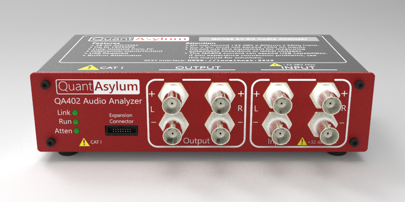The QA402 is our 3rd generation of audio analyzer and can provide a wide range of audio measurements, making it a cost-effective addition to your bench. Unlike a sound card, the QA402 offers isolated and differential input and output, with input handling up to +32 dBV (40Vrms). The QA402 offers 8 input range, from 0 dBV up to 42 dBV full scale (note the max input, however, is +32 dBV). The output drive is also differential, with 8Vrms (+18 dBV) single-ended or 16Vrms (+24 dBV) balanced.